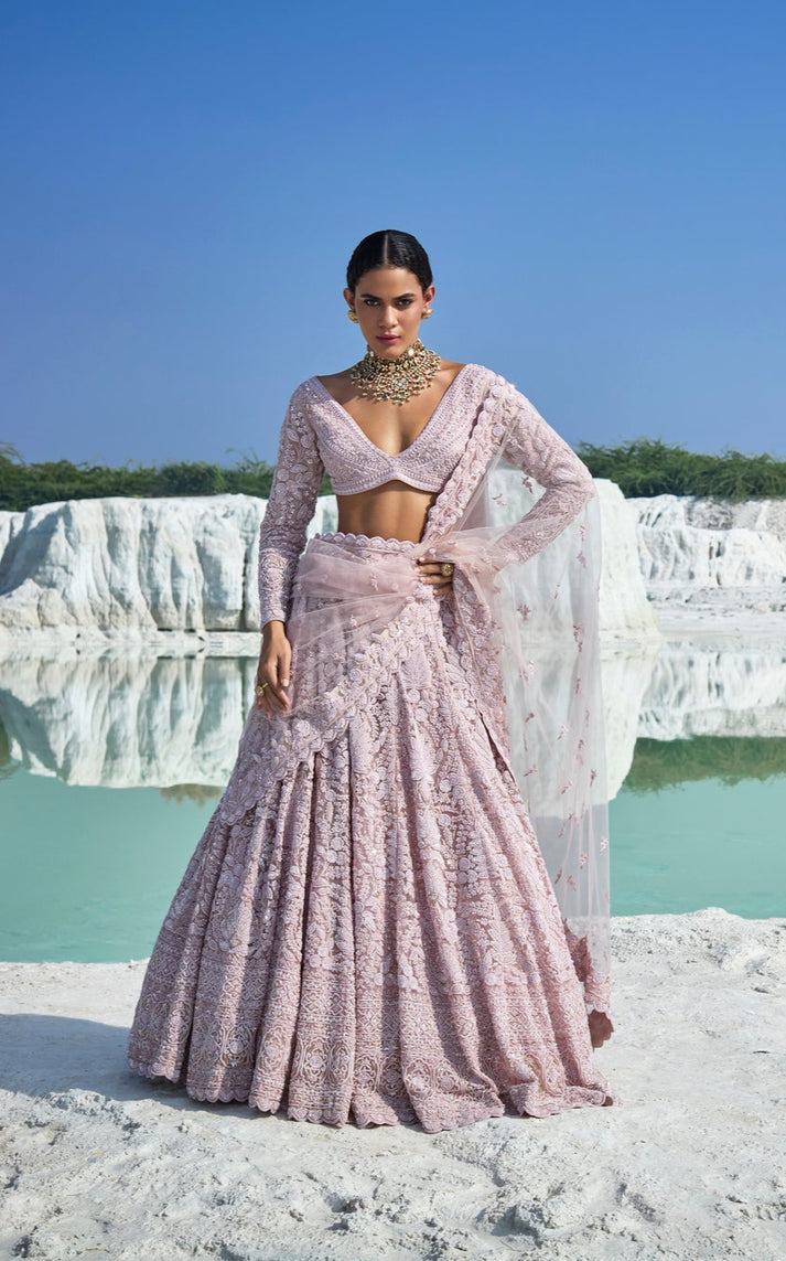 Why it’s perfect: The lightweight fabric, the subtle color, and delicate embellishments make it the go-to lehenga for cocktail party nights where you want to turn heads and dance freely.