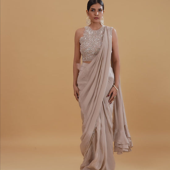 The sumptuous and flowing drape of the Crepe fabric in a classic Beige color, beautifully elevated by the heavy, concentrated sparkle of Moti, Sequins, and Cutdana detailing on both the saree and the Net blouse