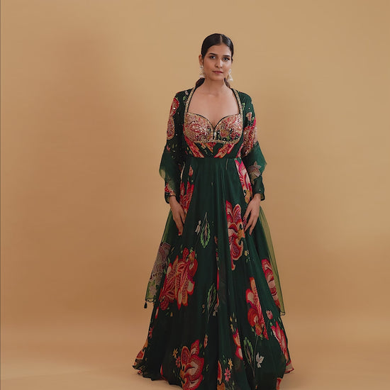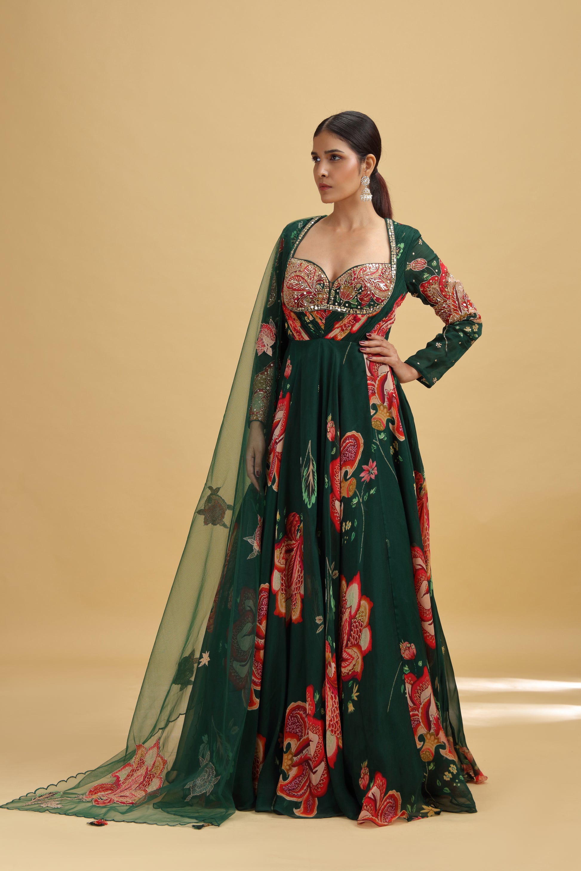 Bottle Green Crepe Gown with Mirror & Resham Work