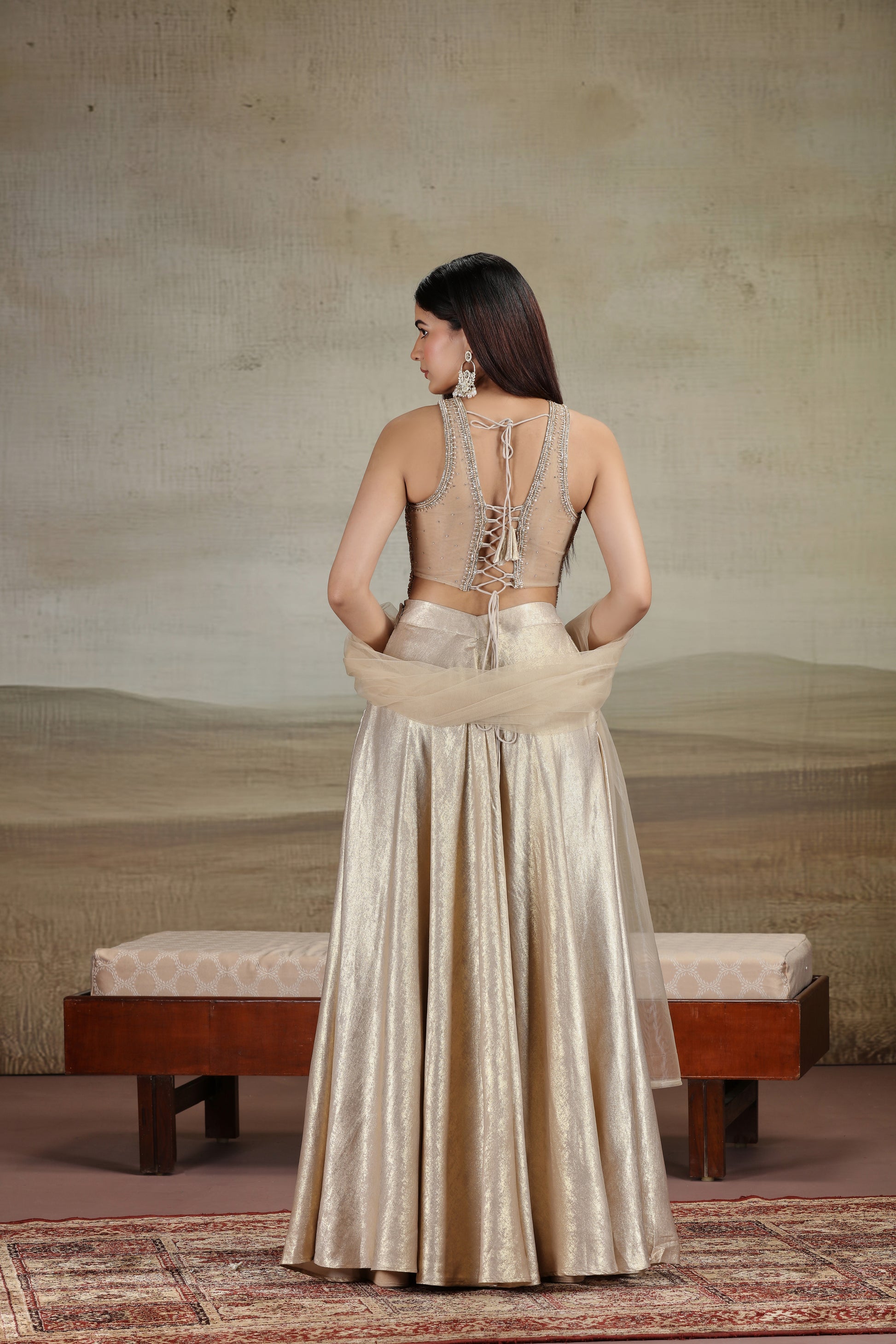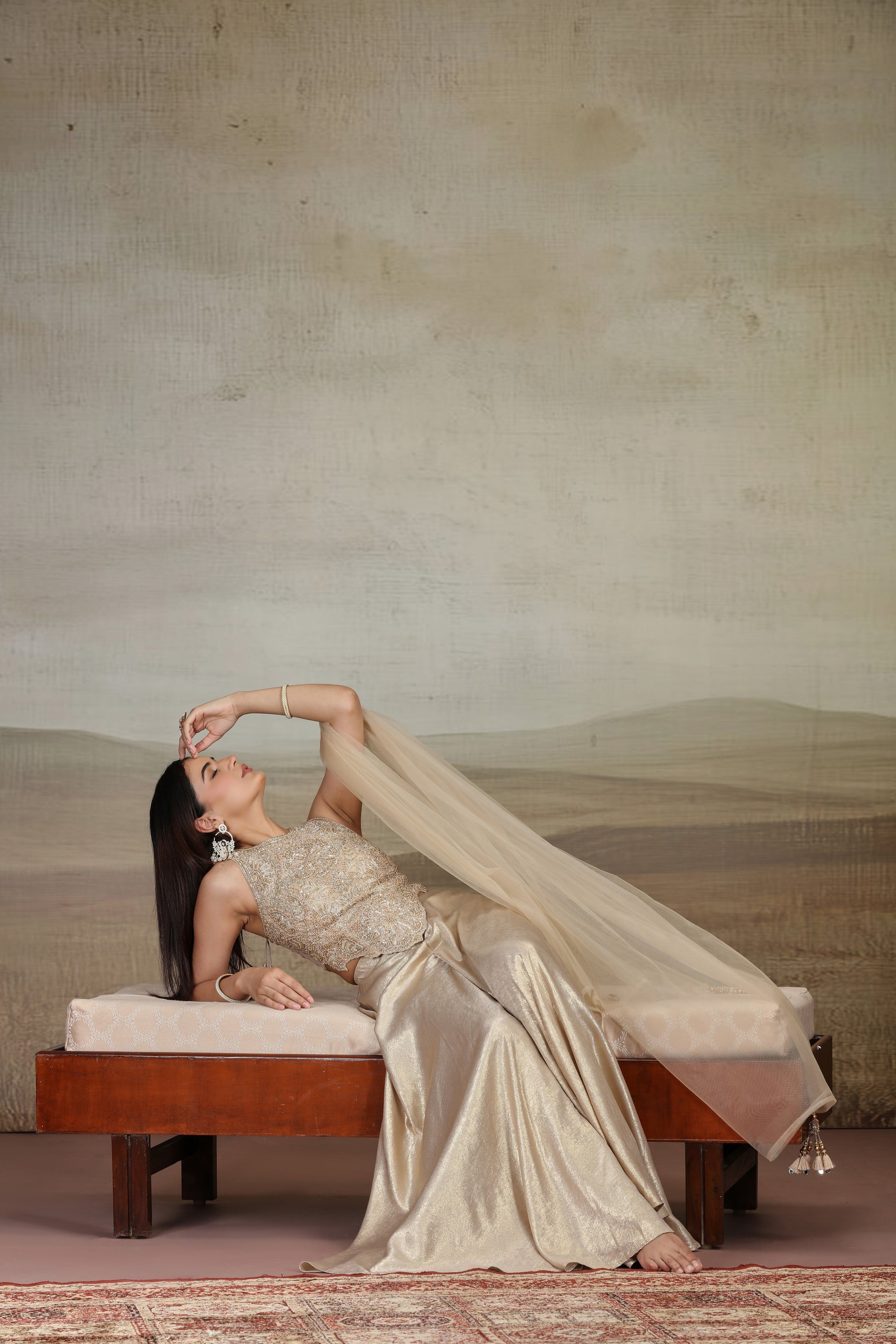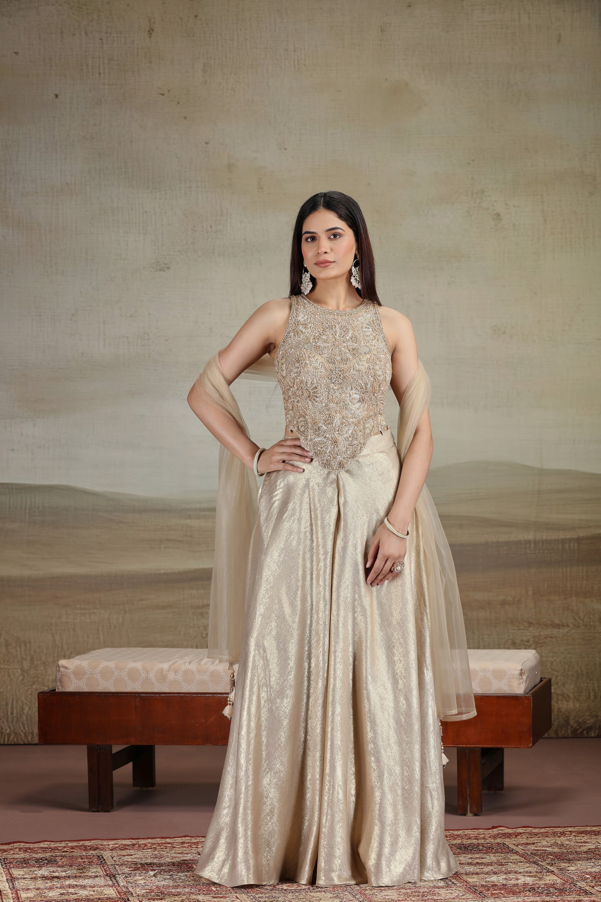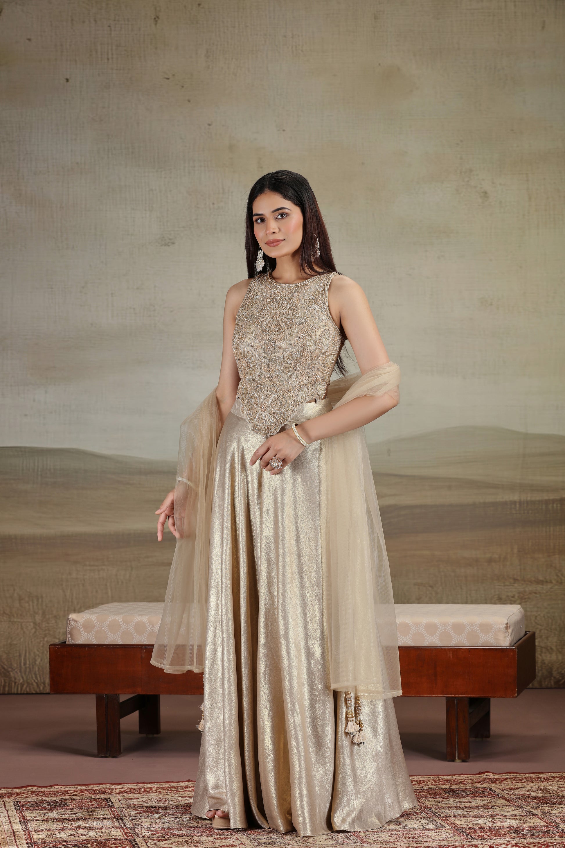 An opulent gold outfit crafted in net and velvet, enhanced with sequins, cutdana, pearls, stone and zari work. Designed for grand receptions and wedding celebrations.