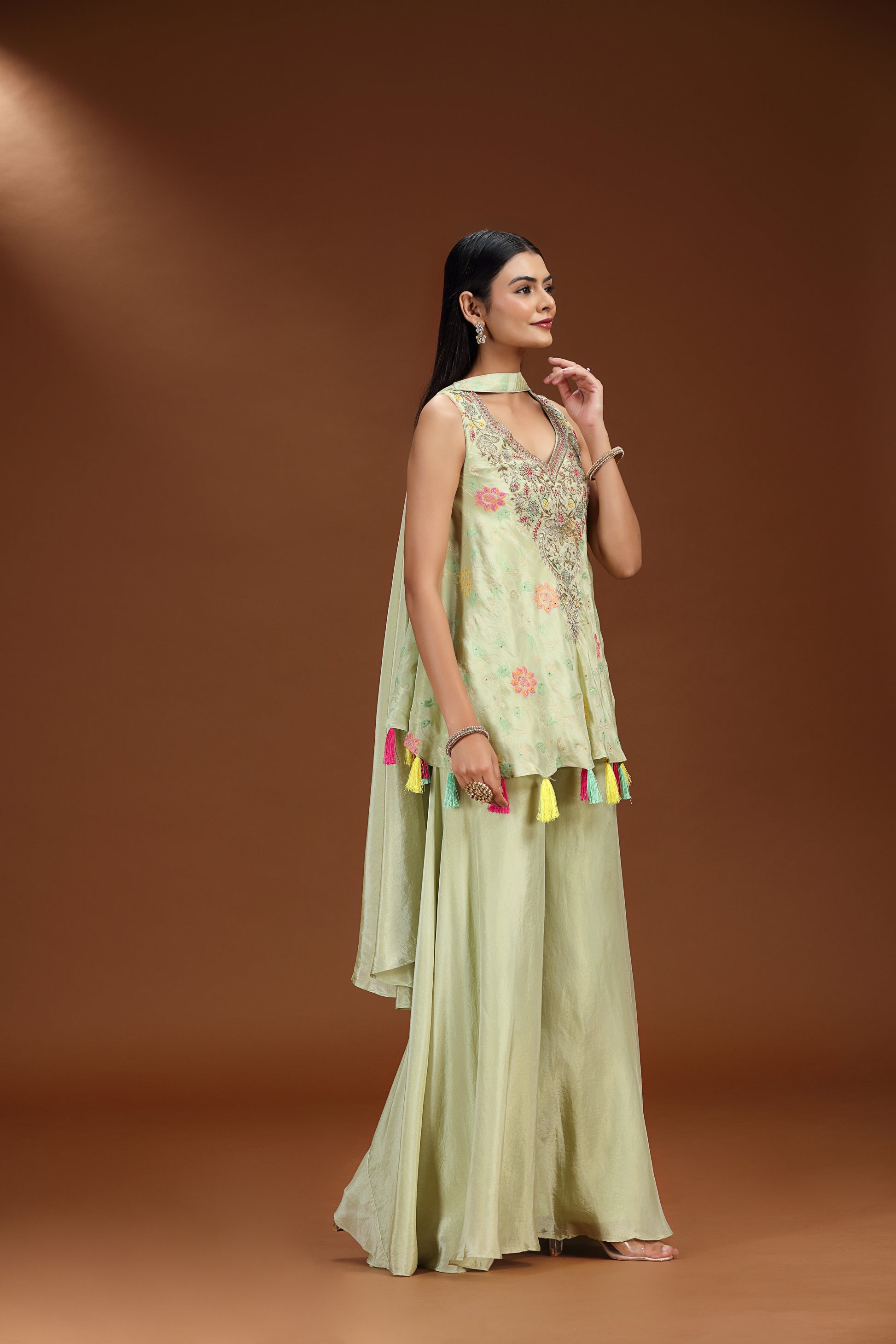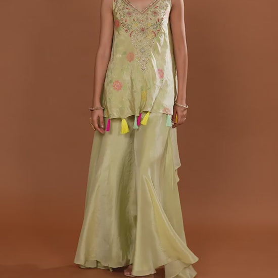 This green salwar suit is a fusion of rich textures and delicate detailing. The kameez is made from Banarasi silk, featuring handwork in cutdana, French knots, stone embellishments, and zari—blending traditional embroidery with luxe fabric. The salwar and dupatta in tissue fabric add a soft, sheer contrast to the heavier kameez, making the outfit feel light despite its festive richness.