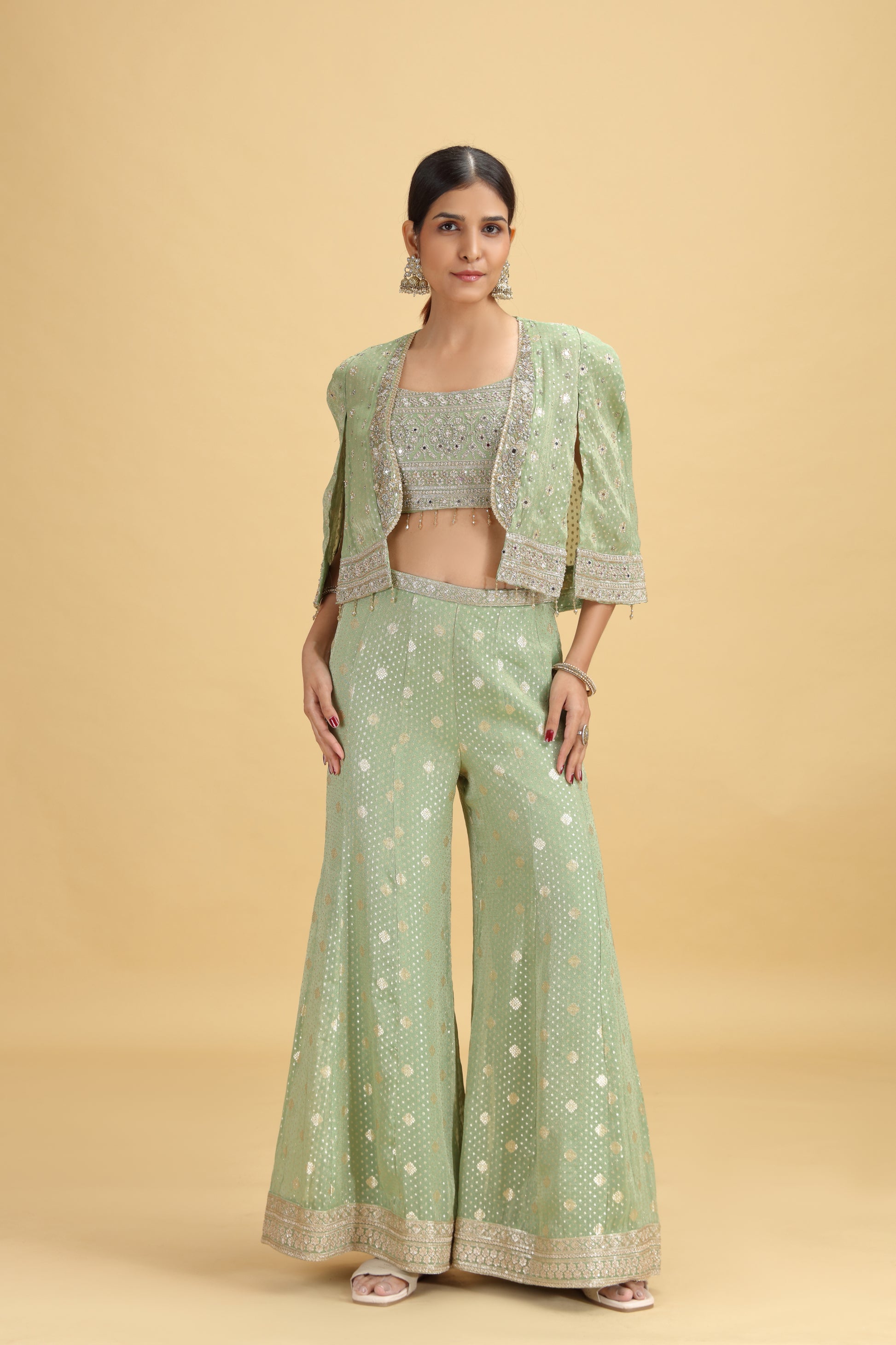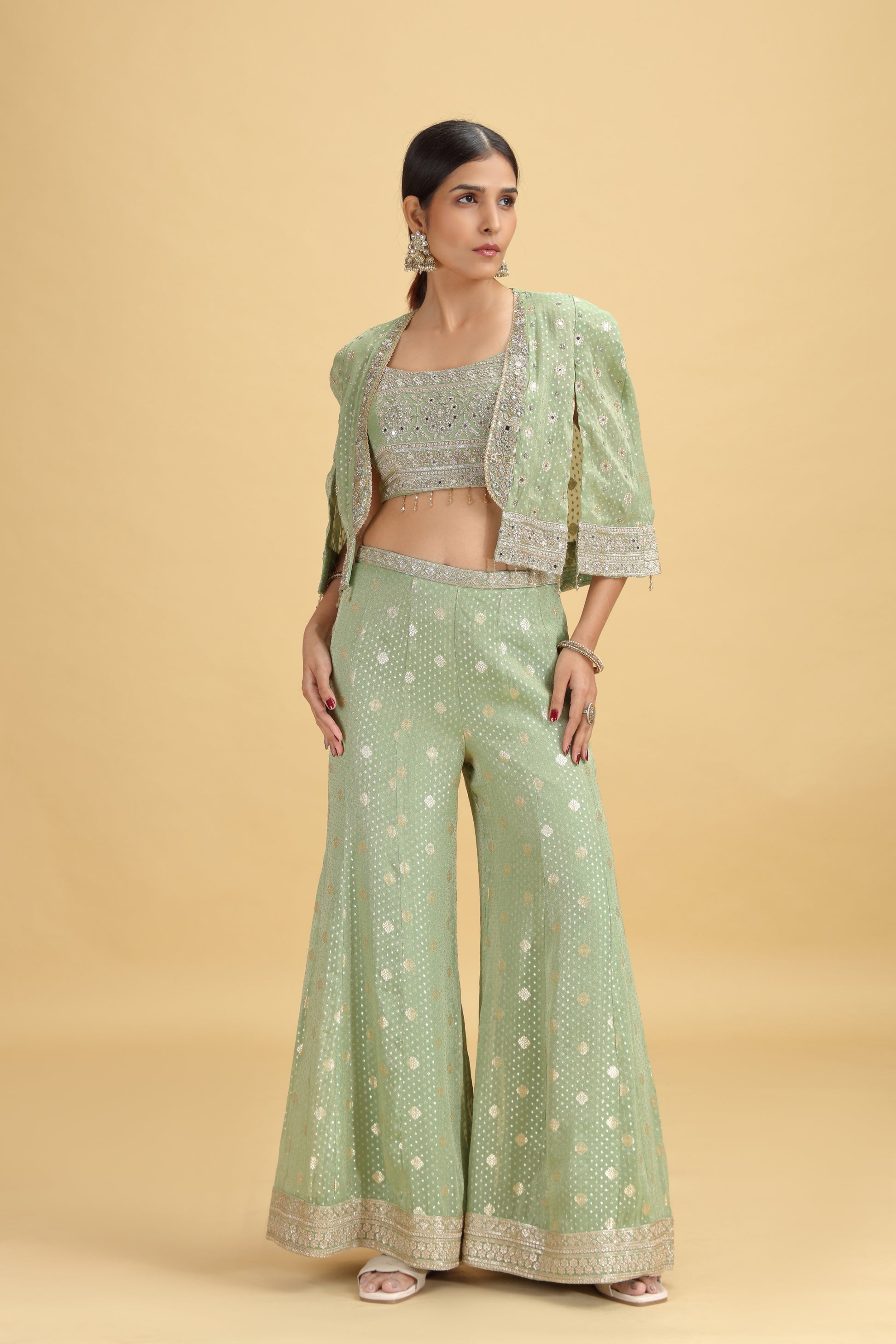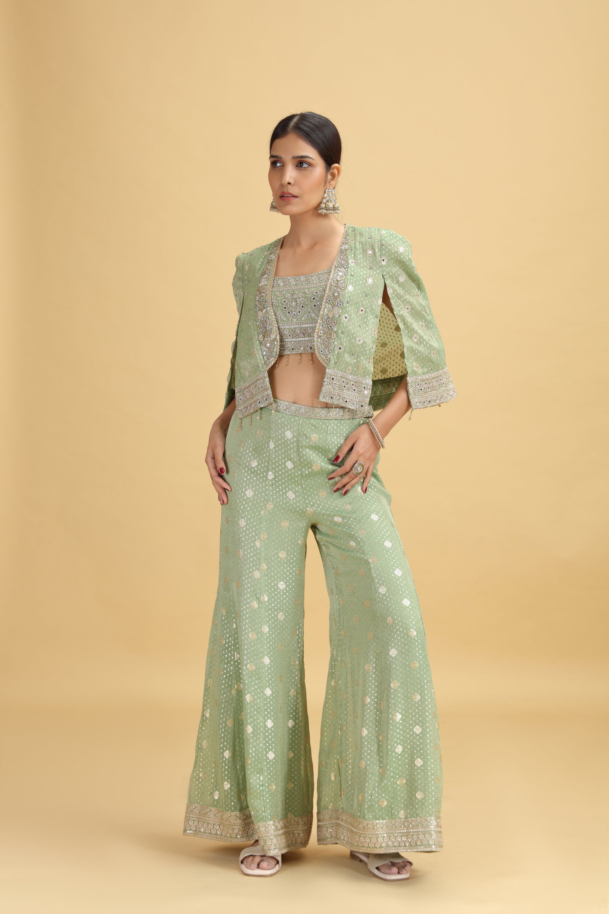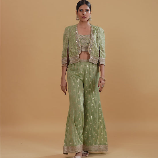 Green Banarasi Silk Suit Set with Mirror, Stone & Zari Work