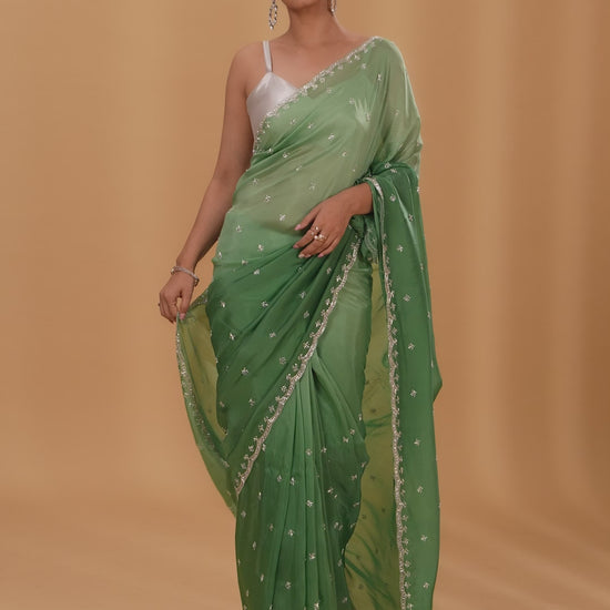 | Highlight | The highlight of this saree is the combination of cutdana, pearl, and stone embellishments on soft green Crepe fabric, giving it a refined and festive charm. | - |
