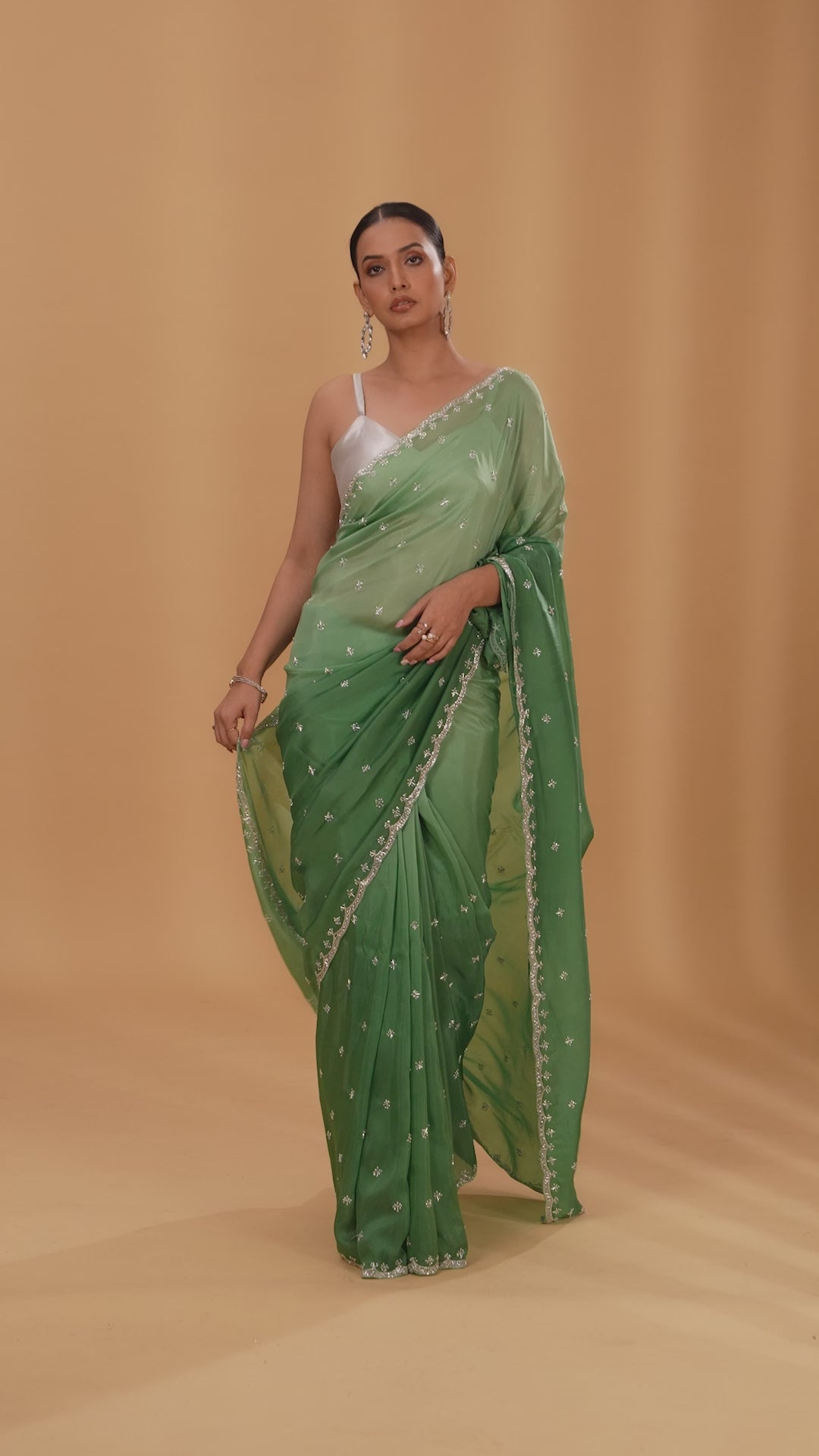 | Style note | Pair this saree with gold or pearl jewellery for a sophisticated festive look. Style your hair in loose curls or a sleek bun, keep makeup minimal, and carry a matching green or gold clutch to complete the outfit. | - |