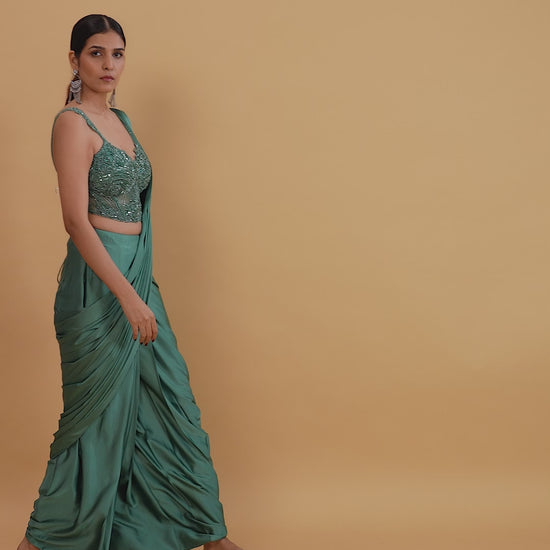 Green Crepe Saree with Net Blouse & Moti-Sequins Work