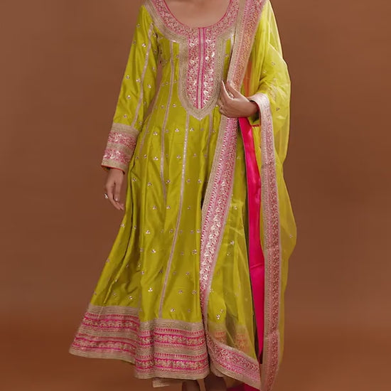 This green salwar suit pairs the richness of raw silk with the lightness of net for a balanced festive look. The kameez features detailed lace accents along with mirror work, sequins, cutdana, and zari embroidery—creating texture and soft sparkle against the structured fabric. The raw silk salwar matches the kameez, while a sheer net dupatta adds contrast and flow to the outfit.