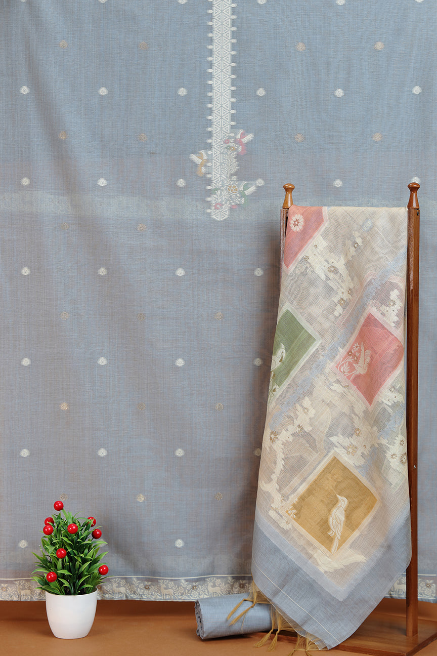 A soft grey kurta fabric featuring a delicate vertical embroidered panel with subtle floral accents. Elegant and easy to style for everyday or festive wear.