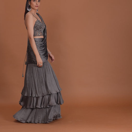 Grey Lehenga Set with Net Blouse, Crepe Skirt & Mukesh Work