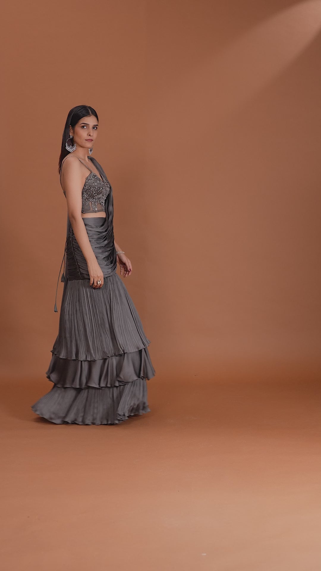 The modern monochromatic Grey color scheme is elevated by the contrasting textures of the Net blouse and Crepe skirt. The Mukesh and Cutdana work provides a brilliant, yet understated sparkle.