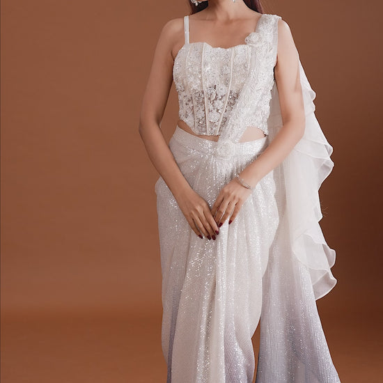 Ivory Net Saree with Stitched Net Blouse & French Knots Detail
