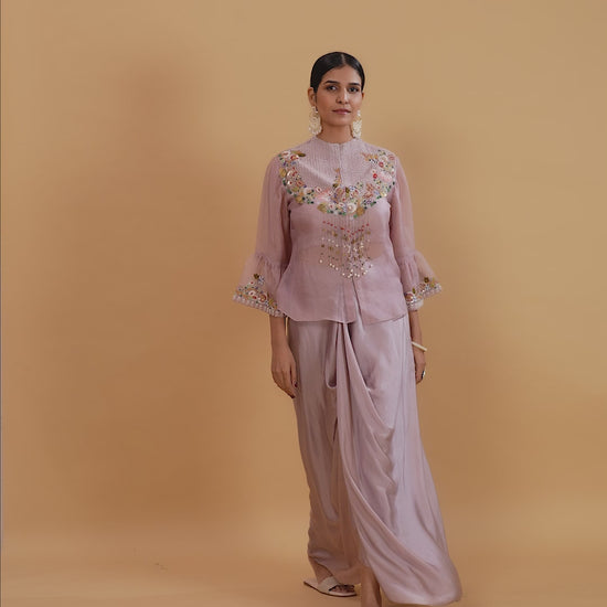 Lilac Satin Silk Suit Set with Organza Dupatta & Dori Work