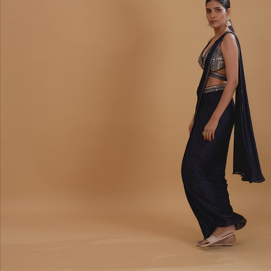 The deep, classic Navy Blue colour on the soft, flowing Crepe fabric offers a flattering drape, brilliantly contrasted by the traditional sparkle of Abla and Mirror Work.