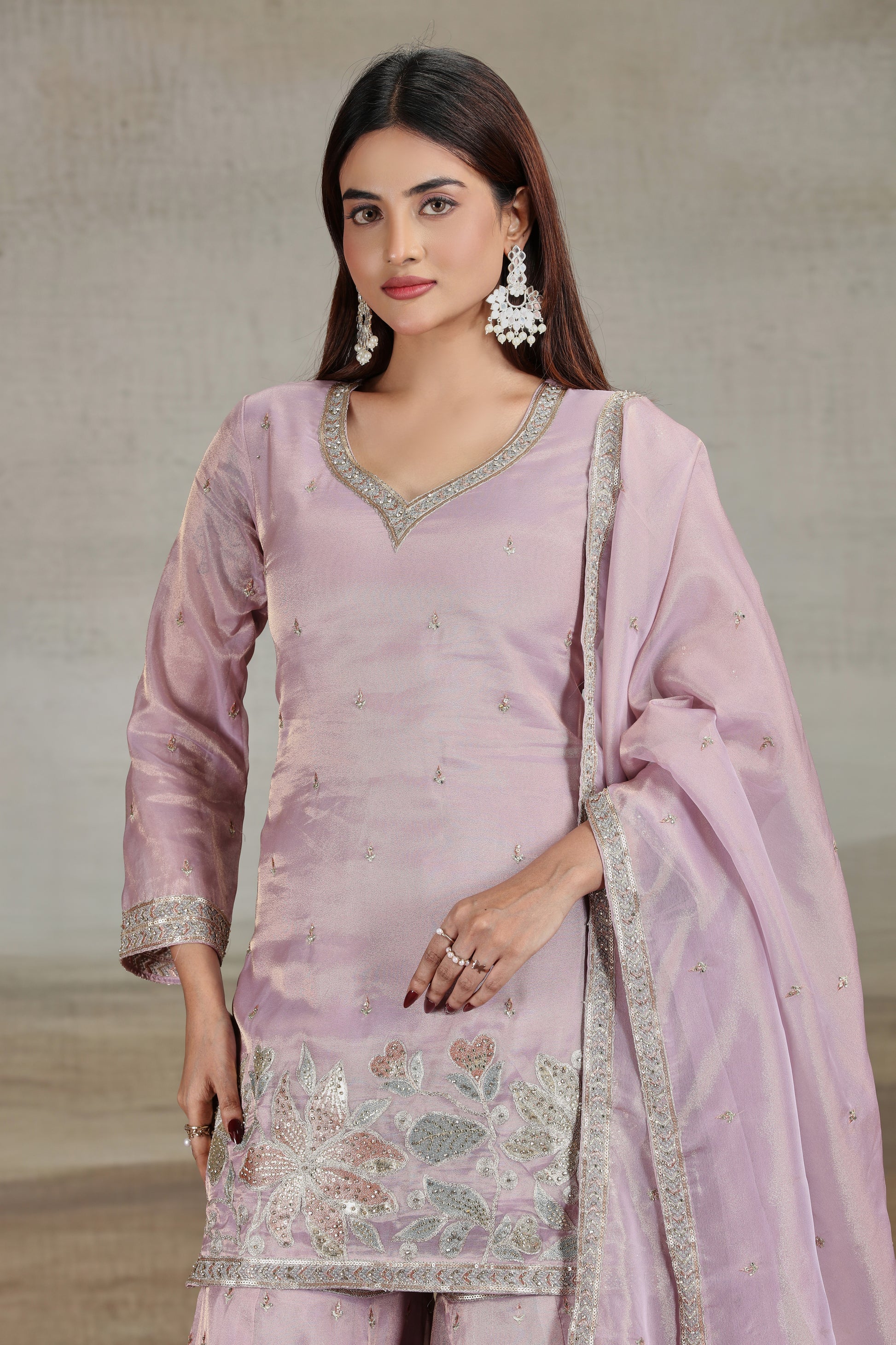 Select a product to compare with Onion Pink Tissue Suit Set with Stone, Tikki & Zari Work