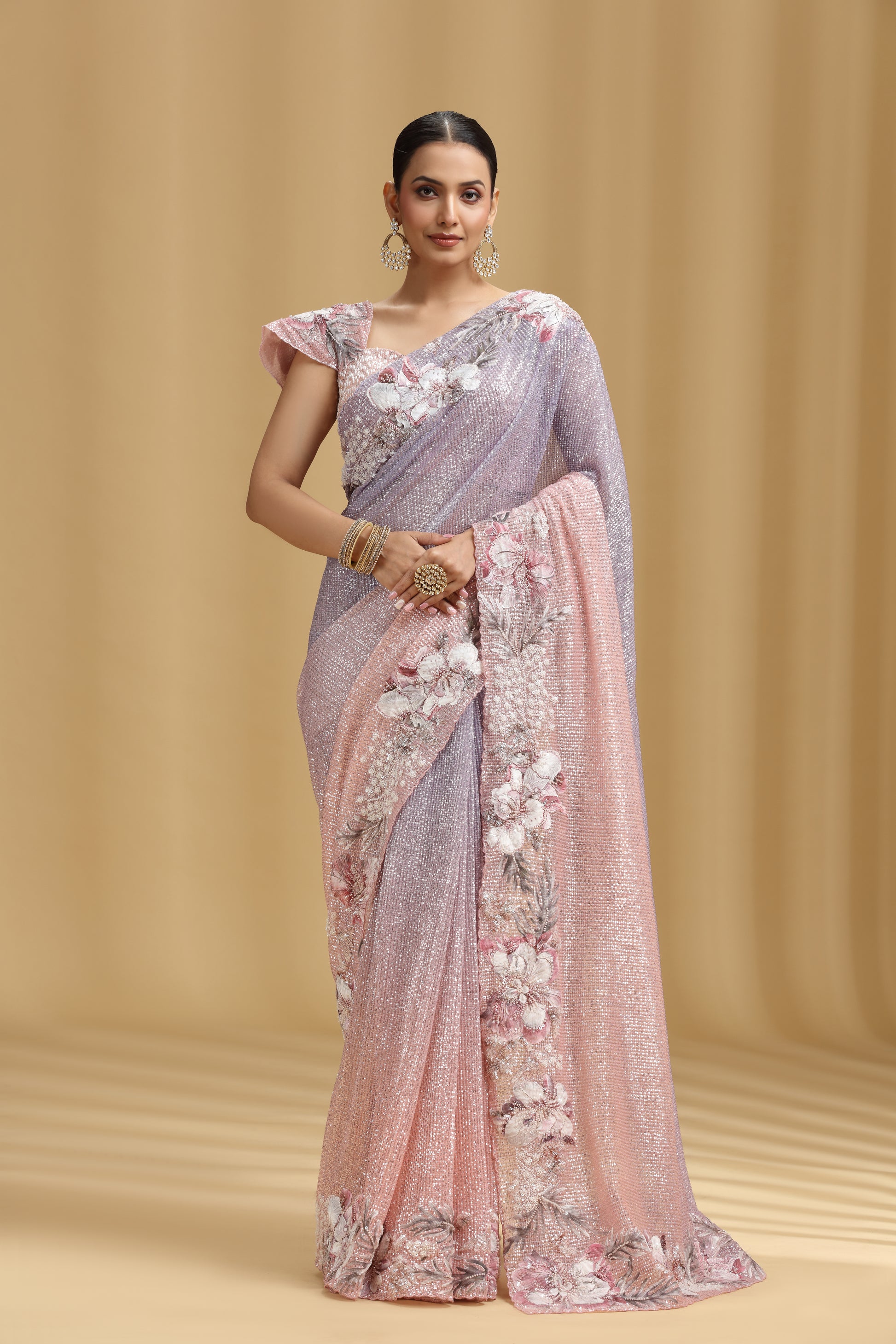 Peach Lavender Ombre Net Saree with Appliqué, Moti, Sequins & Pearl Work (Stitched Blouse))