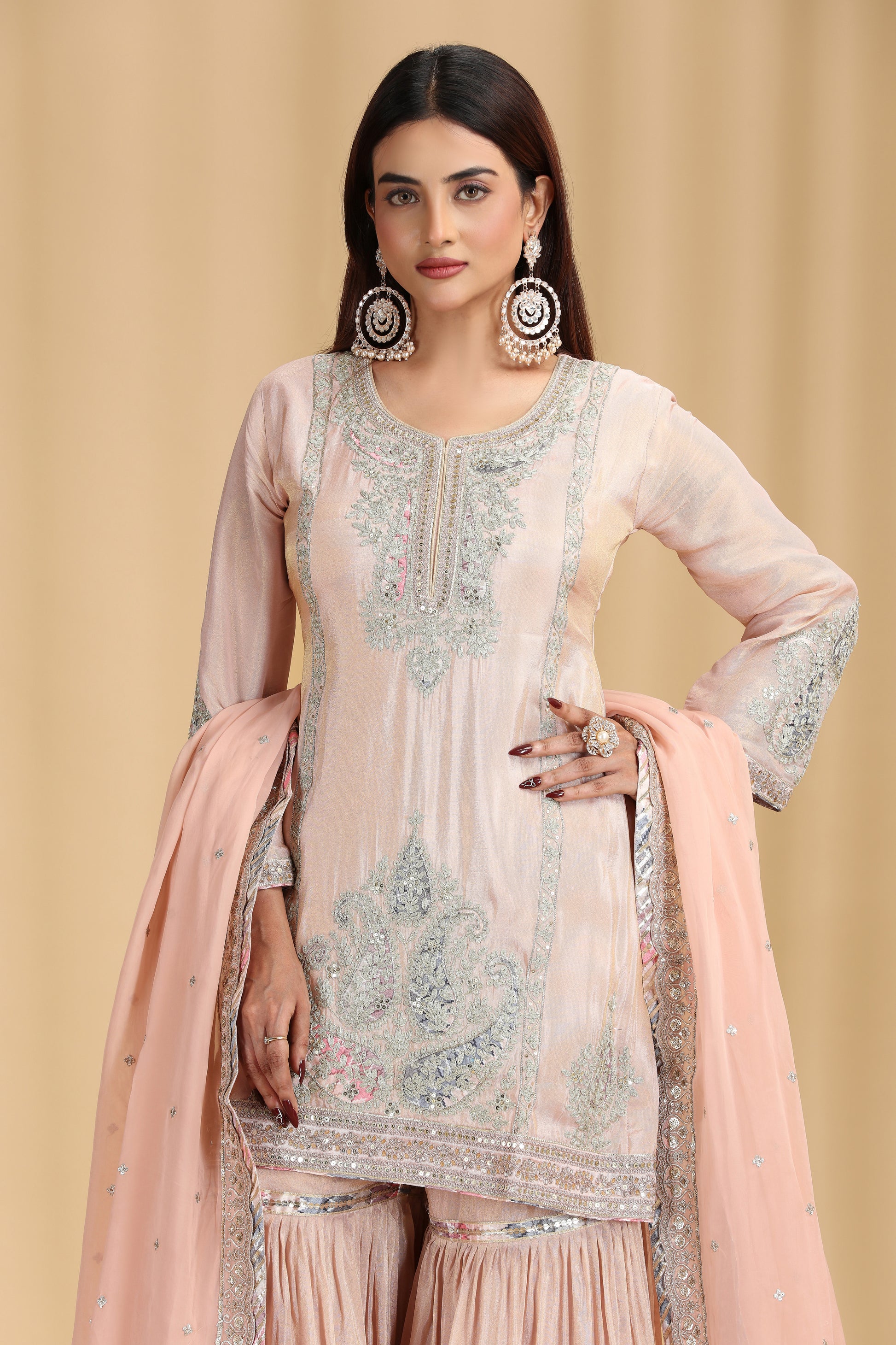 A peach tissue kurta set adorned with intricate pitta and sequin work, creating a refined shimmer across the neckline and front. A timeless festive piece crafted for weddings and celebratory occasions. The fabric of the top is tissue and the dupatta is organza