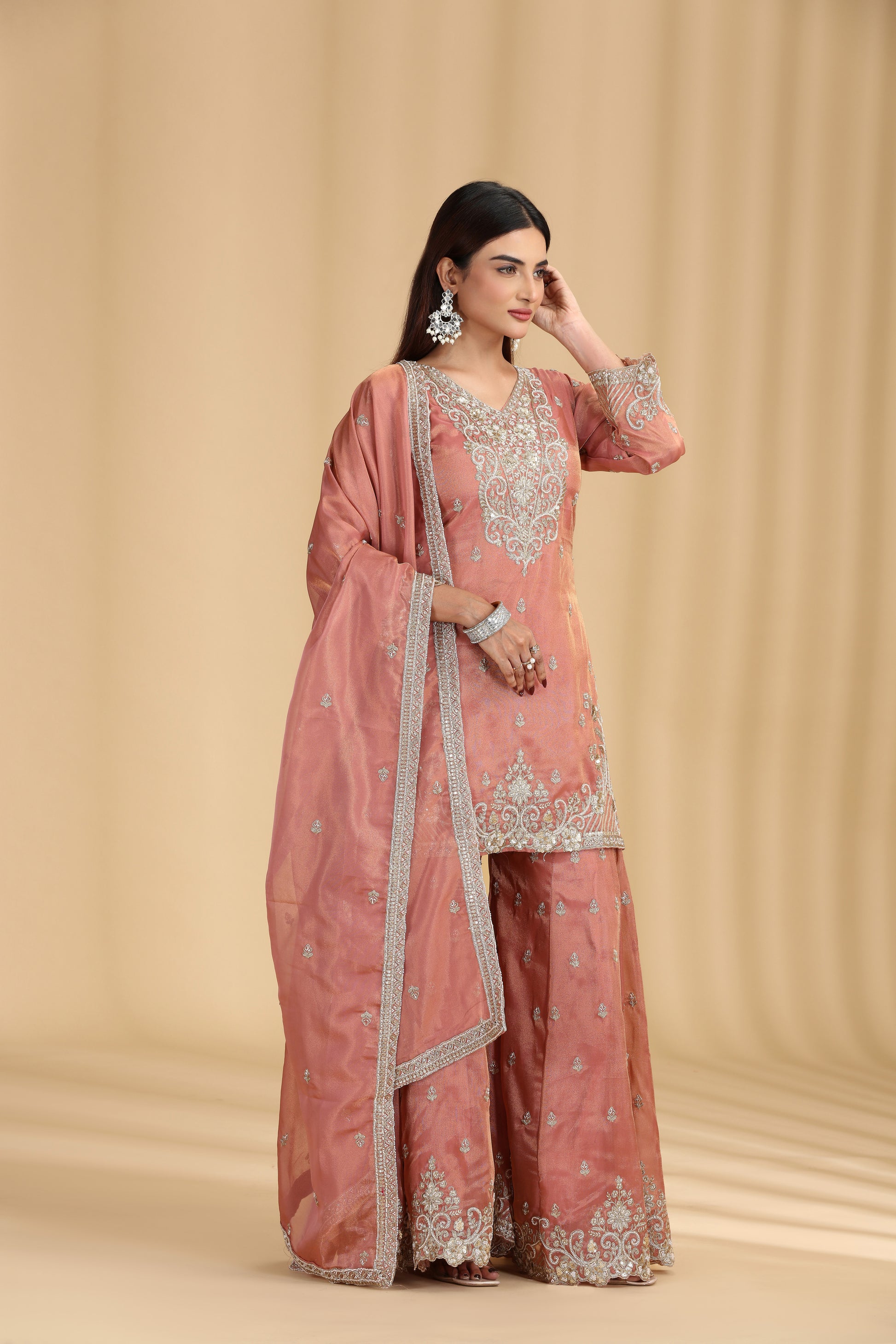 Select a product to compare with Peach Tissue Suit Set with Sequins, Cutdana & Zari Work