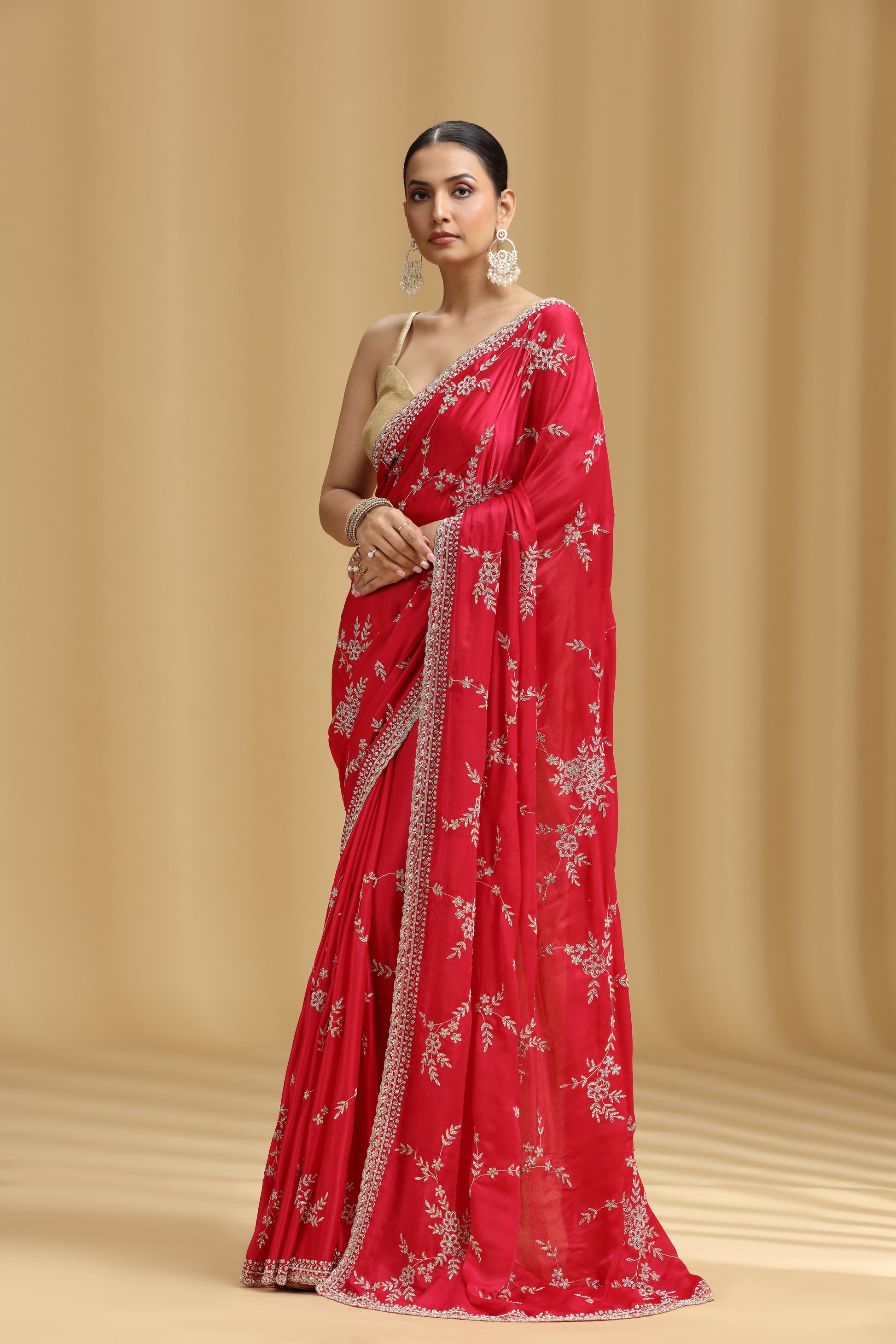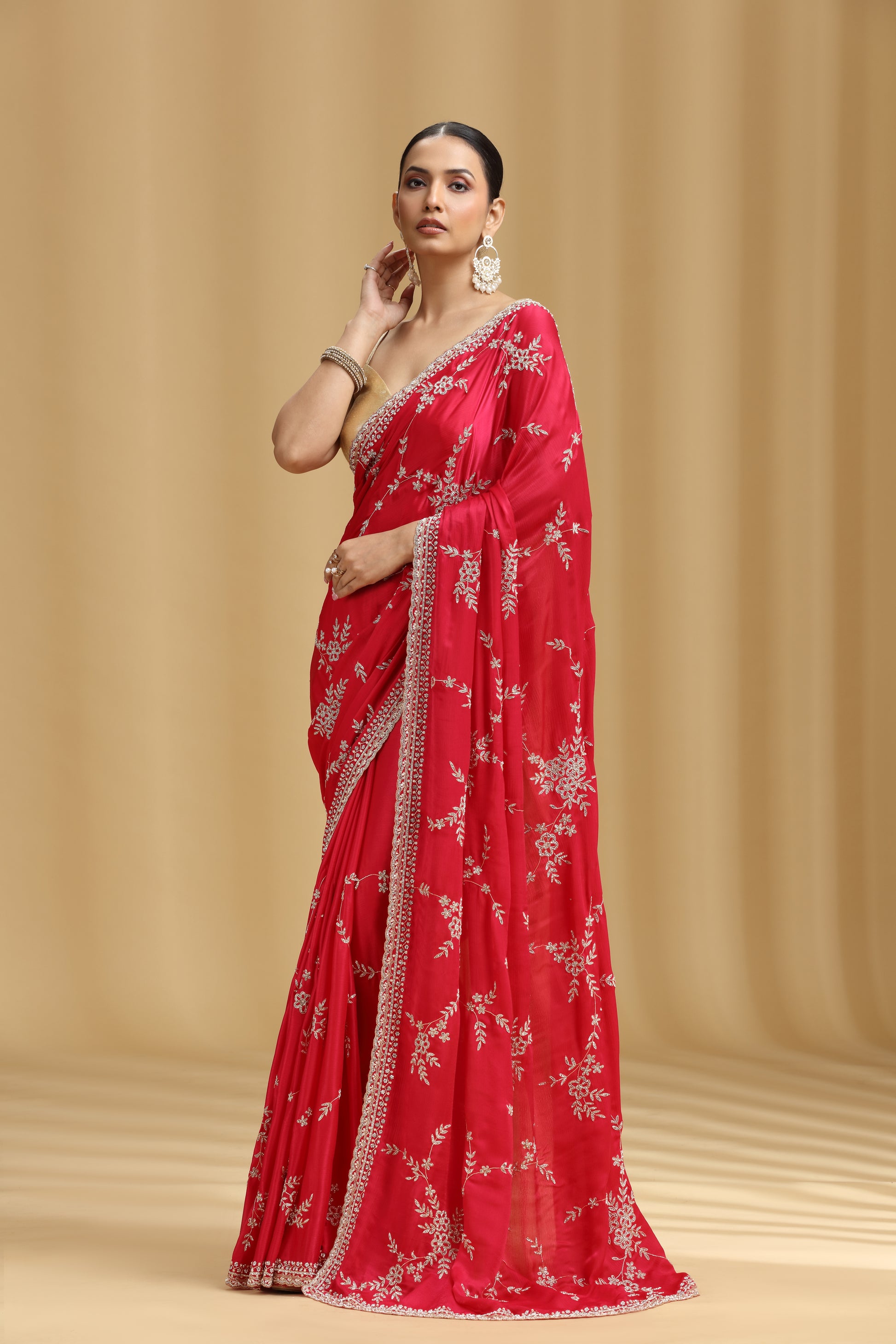 Red Crepe Saree with Dola Silk Blouse & Heavy Embellishment