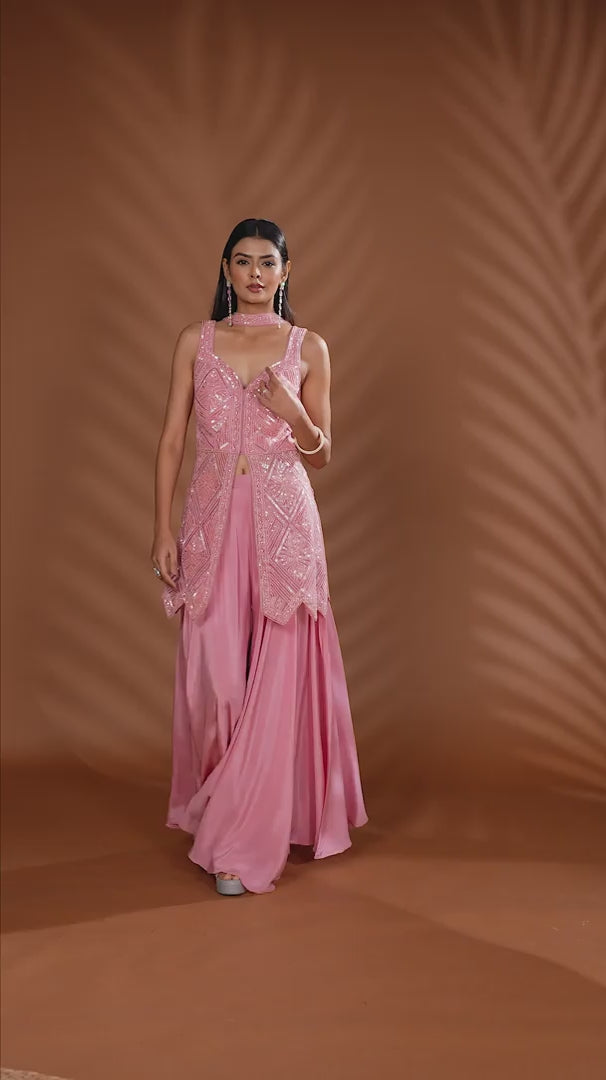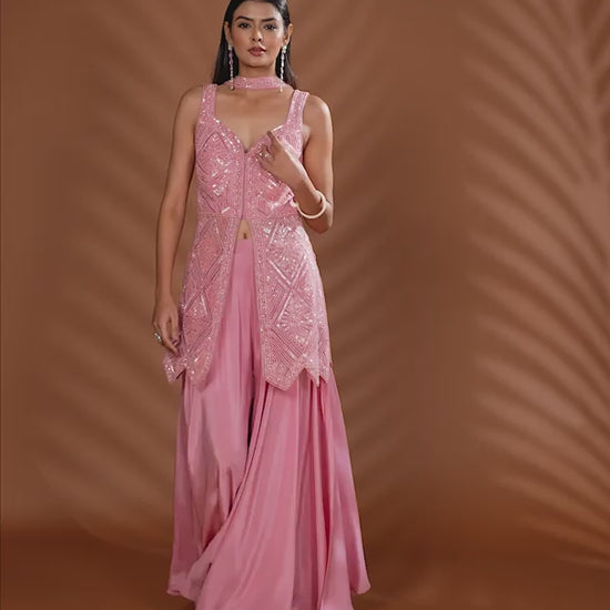 This pink salwar suit is a blend of elegance and sparkle, combining a net kameez with crepe salwar and dupatta. The kameez is delicately adorned with moti, sequins, cutdana, and stone work—giving it a soft shimmer perfect for intimate occasions. The crepe base offers comfort and fluidity, making this set ideal for long-wear events without compromising on glam.