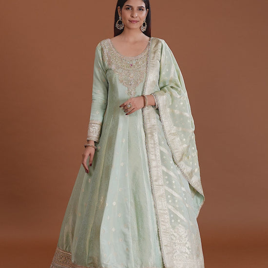 Pista Green Banarasi Silk Gown with Mirror, Sequins & Pearl Work