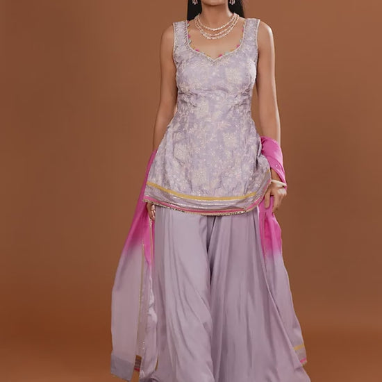 Designed in a rich blend of satin, silk and chinnon, this purple salwar suit makes a contemporary festive statement. The kameez features an ornate mix of abla, mirror work, moti, stones, and zari embroidery—beautifully balanced across a structured silhouette. The matching chinnon salwar offers fluidity and comfort, while the organza dupatta adds a light, sheer contrast to the outfit’s richness. Elegant without being overwhelming, this set is perfect for dressy evenings.
