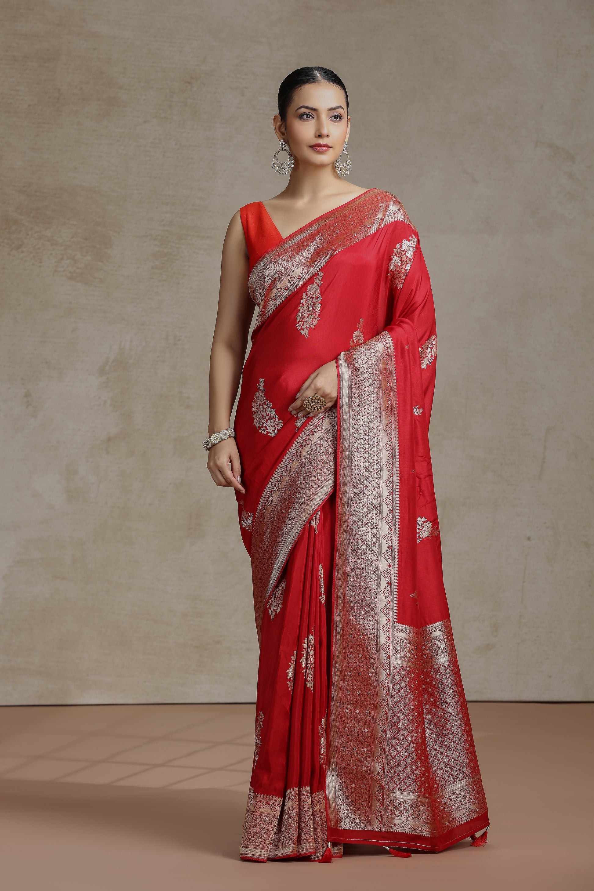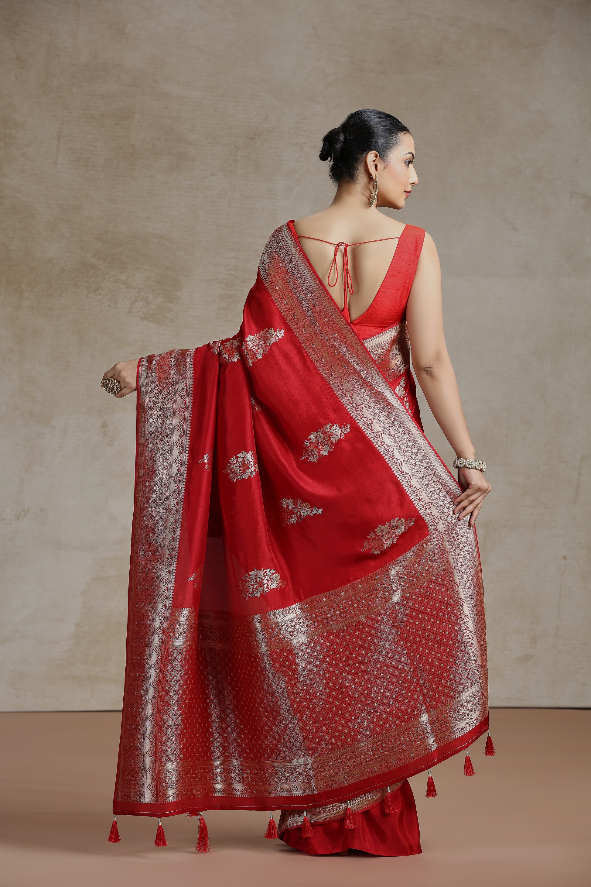 This striking red dola silk saree showcases intricate weaving that adds depth, richness and timeless grandeur to its elegant drape. Bold and celebratory, the design beautifully reflects traditional craftsmanship with a refined festive finish. The saree and blouse are both crafted in dola silk in a coordinated red hue.
