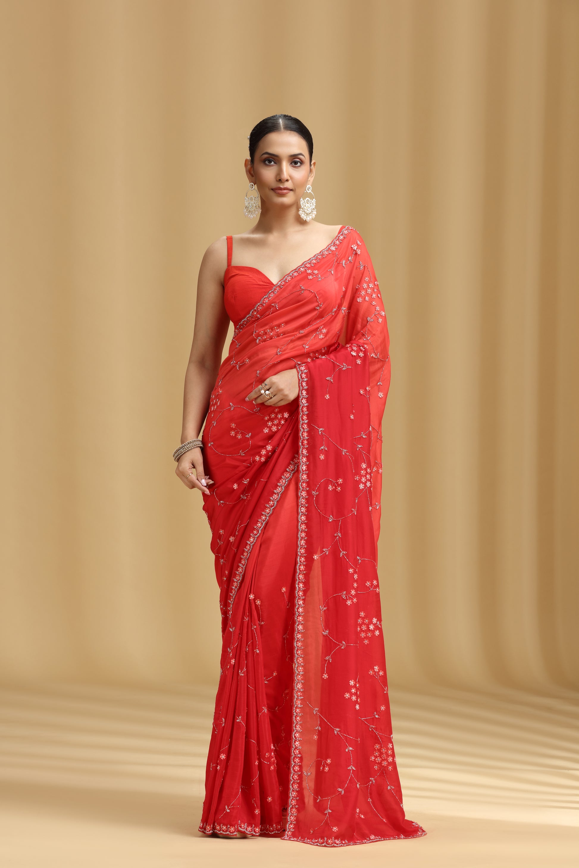 Red Ombre Crepe Saree with Cutdana, Stone & Tikki Work (Unstitched)