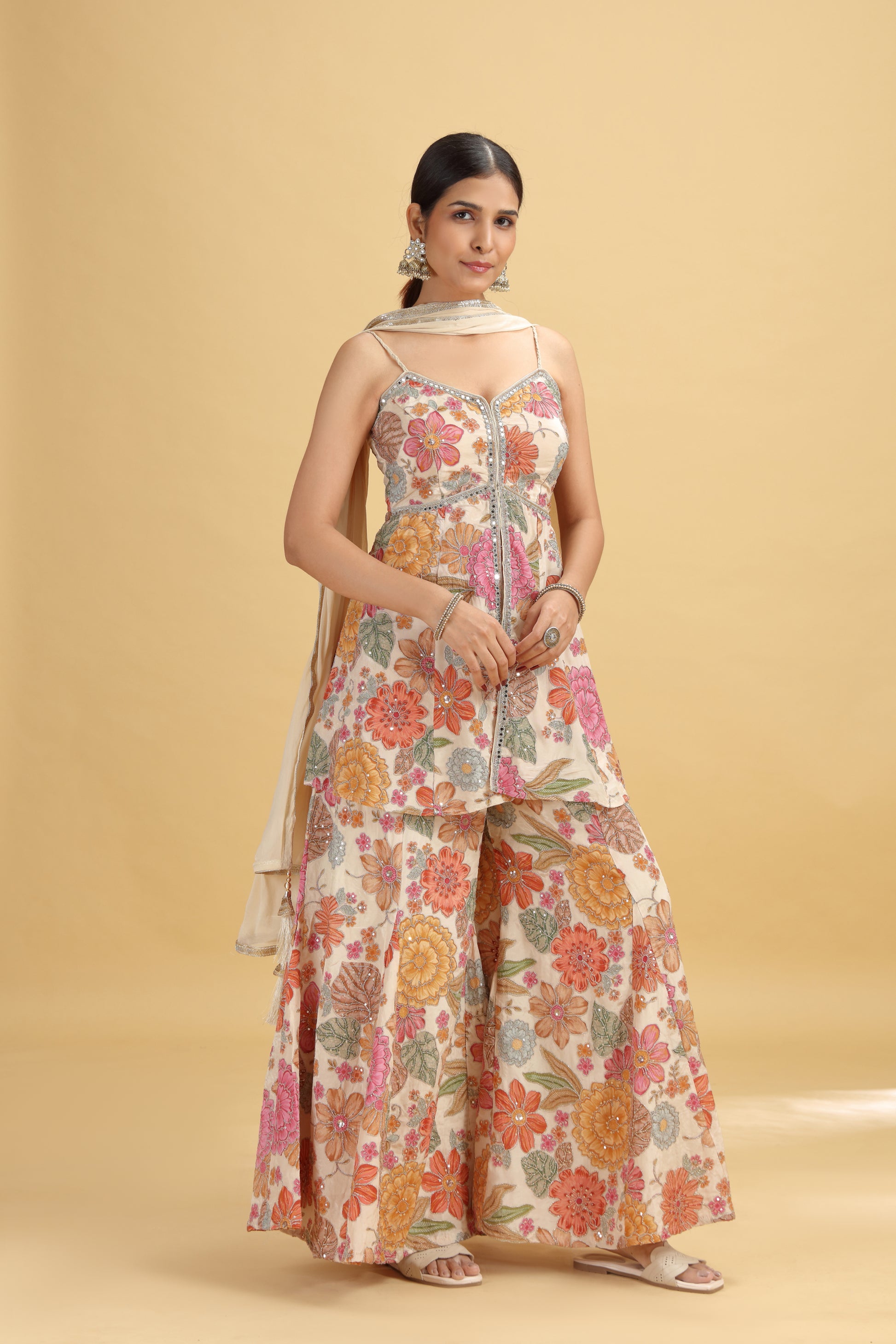 Beige Crepe Suit Set with Sequins, Thread & Cutdana Work