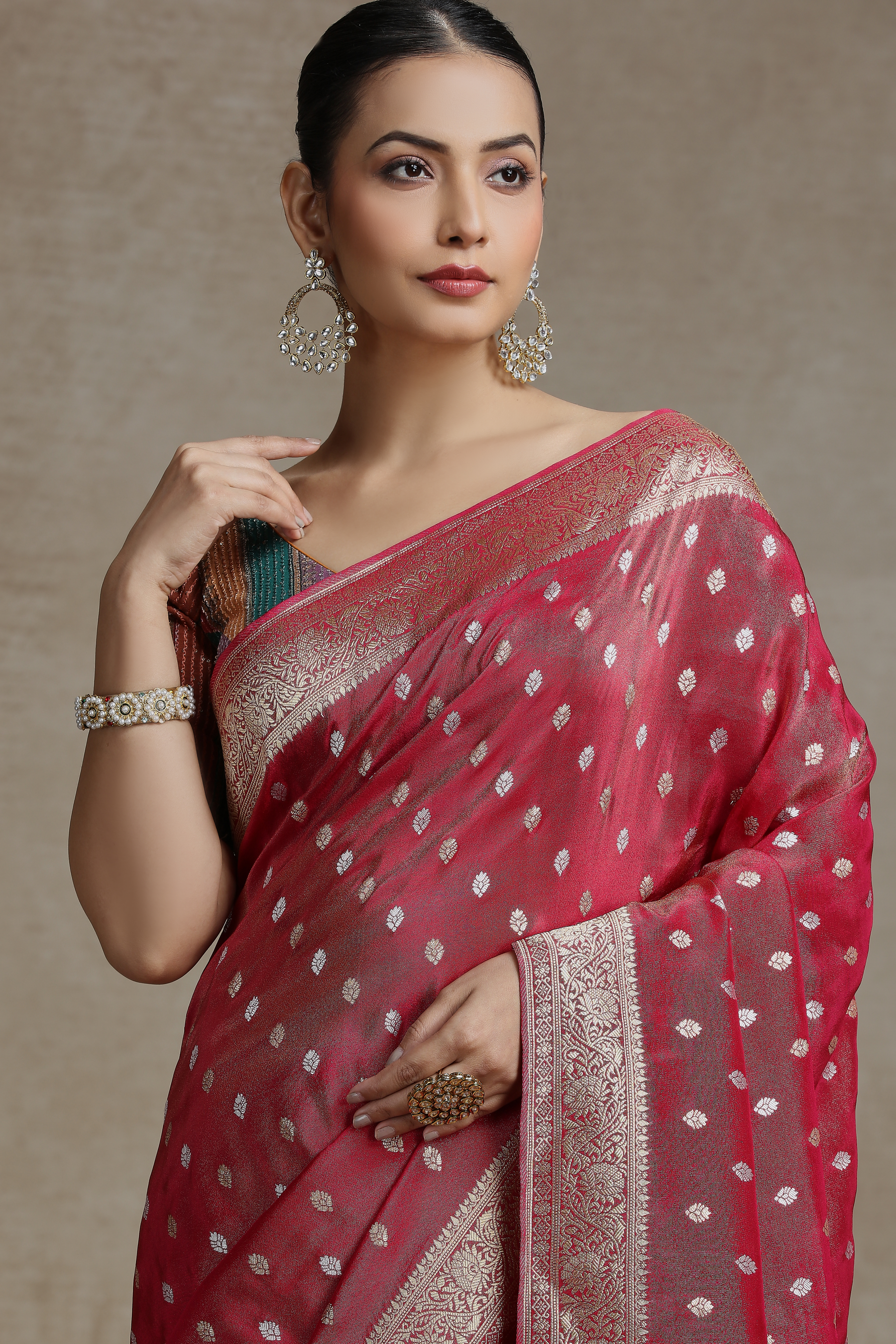 This rich rust dola silk saree showcases intricate weaving that enhances its luxurious texture and structured drape. Warm and festive, the design reflects timeless heritage craftsmanship with a bold contemporary appeal. The saree and blouse are both crafted in dola silk in a coordinated rust tone.