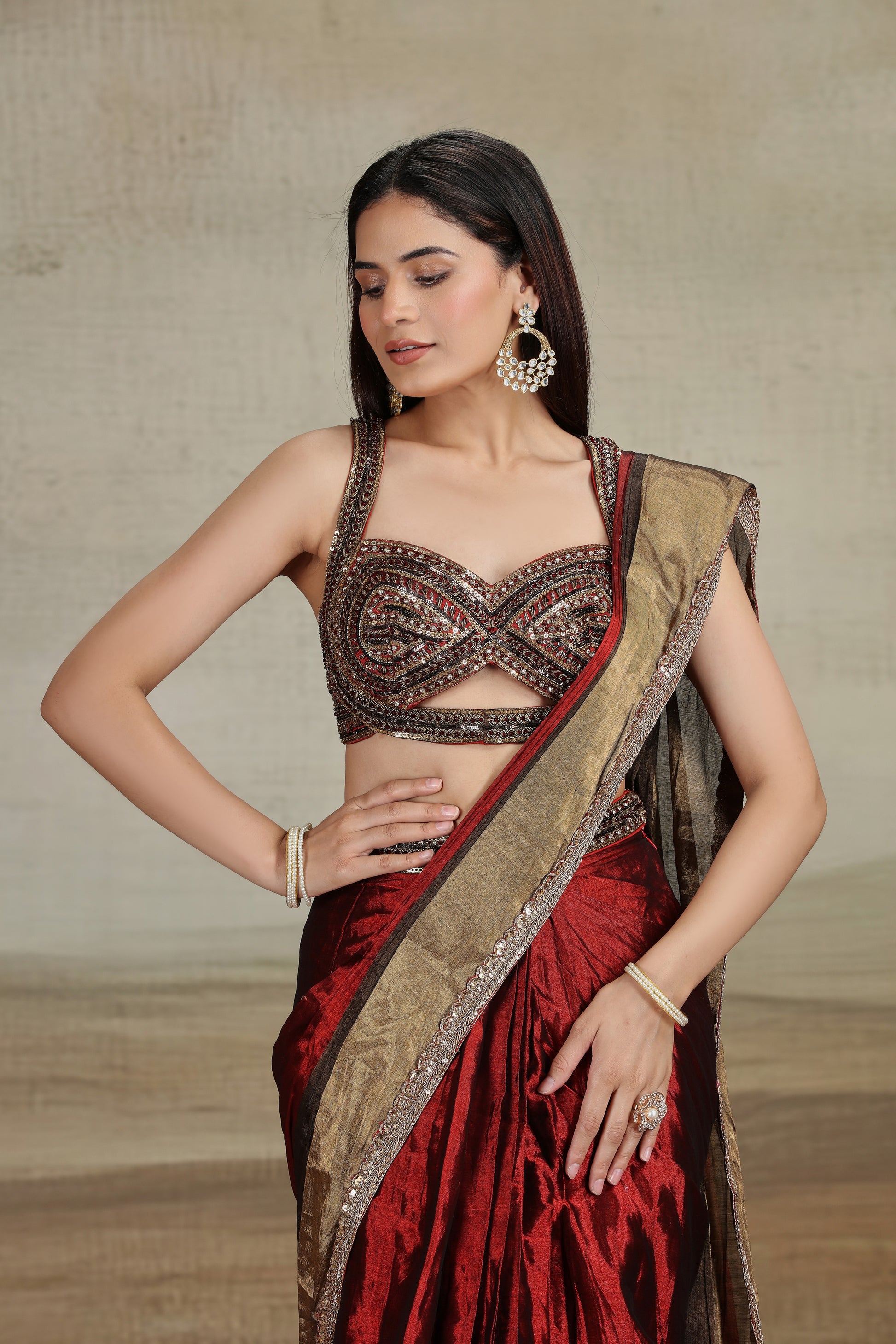 This earthy red and brown saree paired with a striking embellished blouse is perfect for those who want a blend of traditional elegance and modern flair. A unique color palette with intricate detailing.